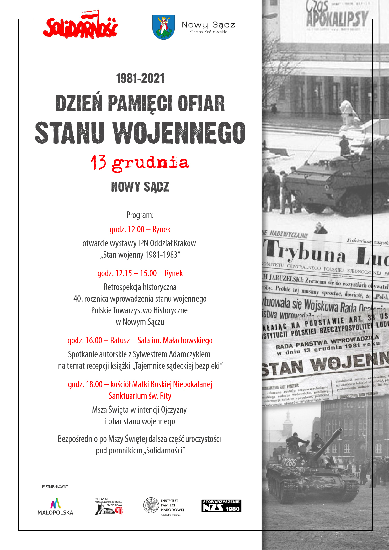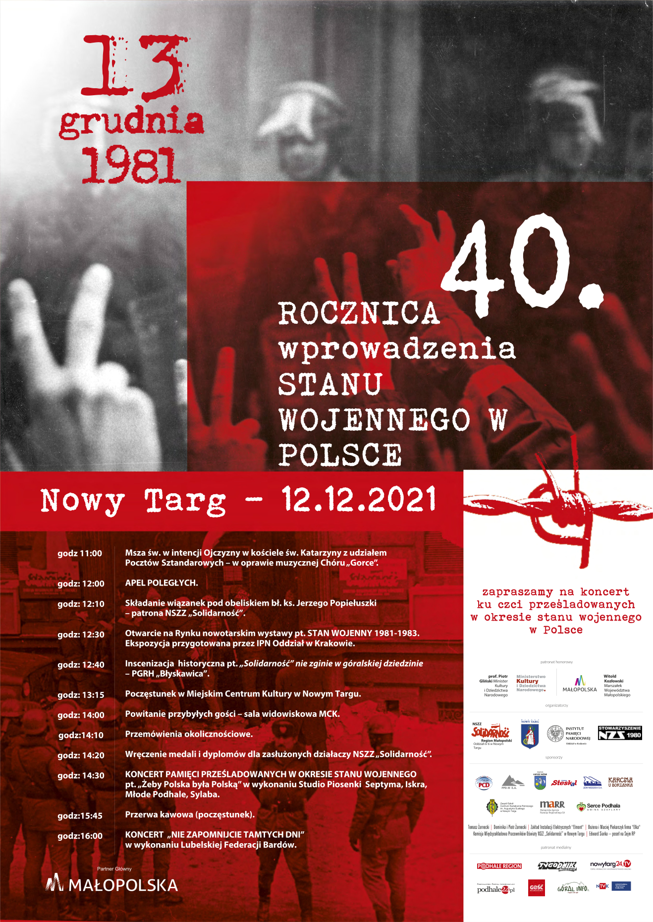 Partnerem głównym obchodów 40. rocznicy wprowadzenia stanu wojennego w Polsce organizowanych przez Stowarzyszenie NZS 1980 jest Województwo Małopolskie (www.malopolska.pl)