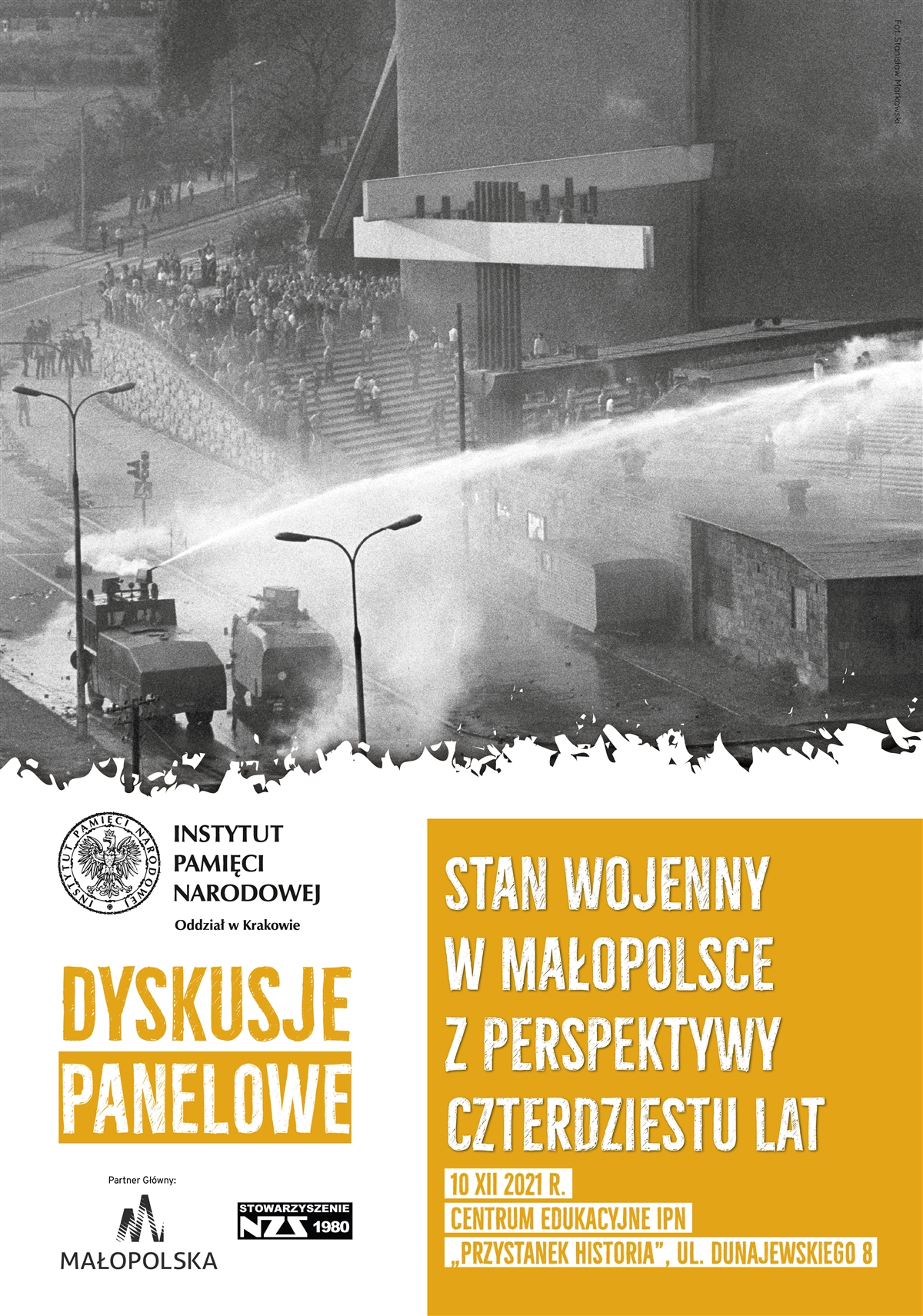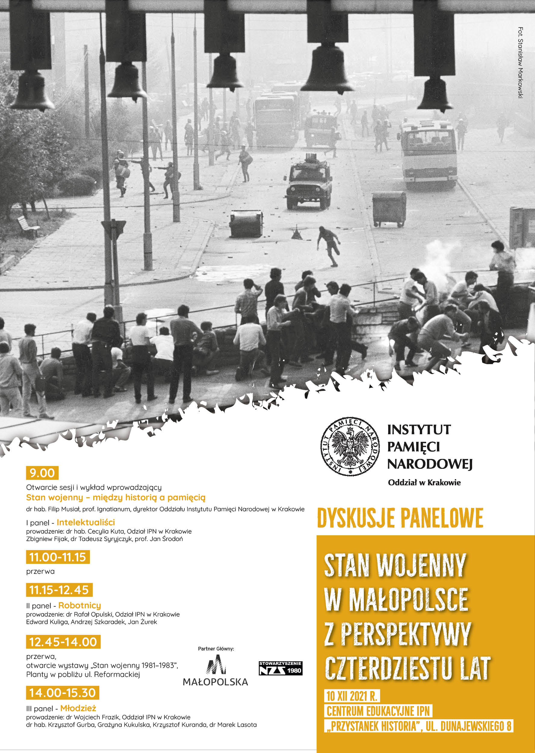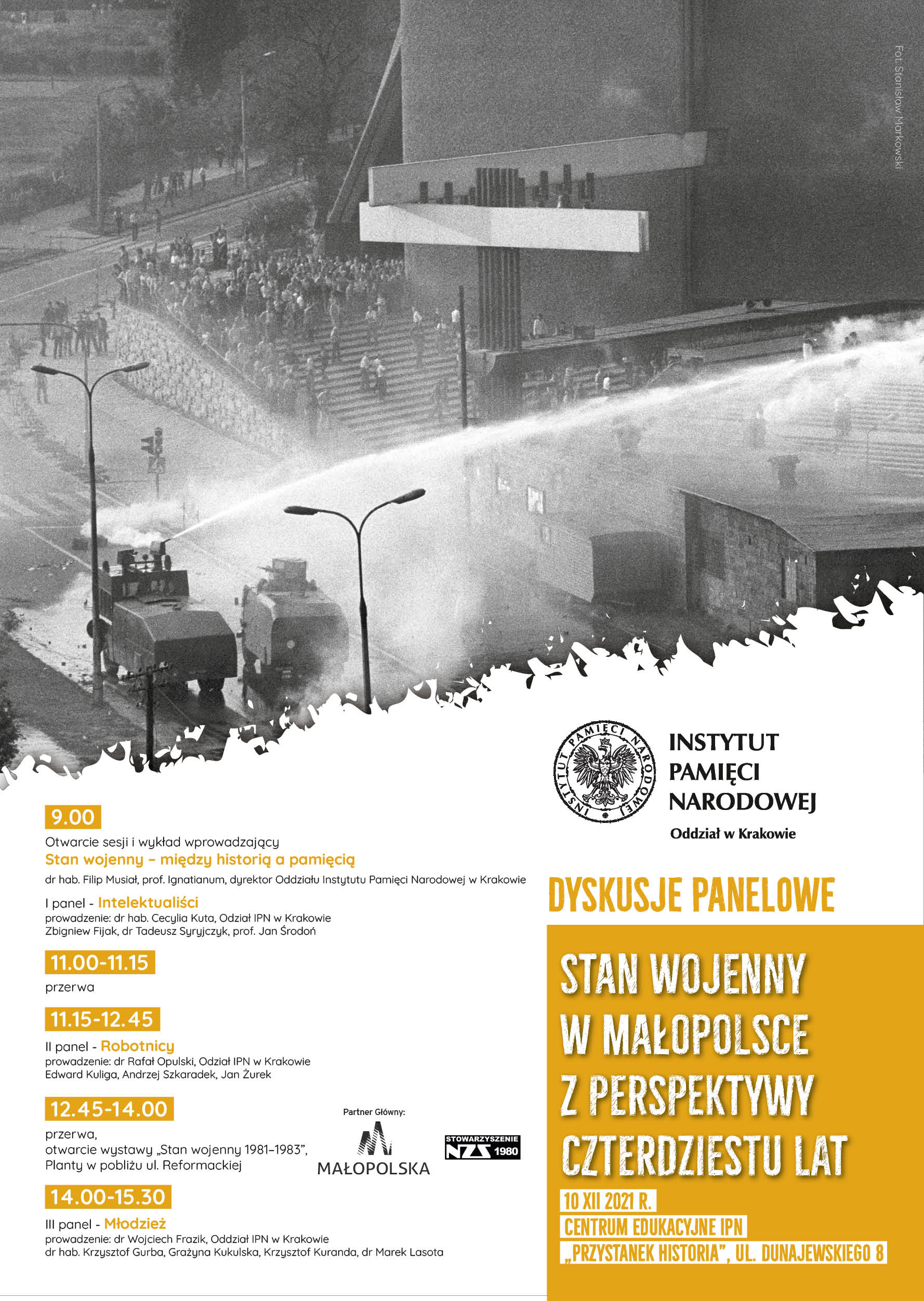 Na początek zapraszamy Państwa na krakowski „Przystanek Historia” (ul. Dunajewskiego 8), gdzie 10 grudnia 2021 r. w godz. 9.00-15.30 dyskutować będą historycy oraz świadkowie wydarzeń sprzed 40 lat. Spotkanie zatytułowane jest „Stan wojenny w Małopolsce z perspektywy czterdziestu lat”. Otworzy je dyrektor Oddziału IPN w Krakowie dr hab. Filip Musiał, a dyskusję podzielono na trzy 90-minutowe bloki tematyczne: intelektualiści, robotnicy, młodzież. W rozmowie wezmą udział: prof. Jan Środoń, dr Tadeusz Syryjczyk, Zbigniew Fijak, dr hab. Krzysztof Gurba, dr Marek Lasota, Grażyna Kukulska, Krzysztof Kuranda, Edward Kuliga, Andrzej Szkaradek i Jan Żurek.