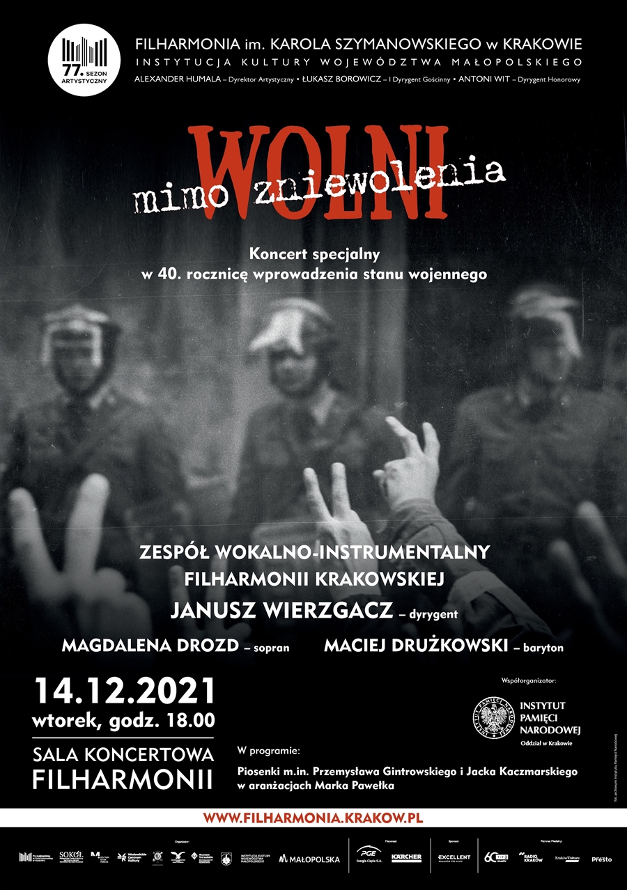Bilety na koncert „Wolni mimo zniewolenia”, którego organizatorami są Filharmonia Krakowska i Oddział IPN w Krakowie w sprzedaży w kasie Filharmonii, w cenie 30 i 40 zł lub pod linkiem: https://www.filharmonia.krakow.pl/Home/10088-Koncert_%22Wolni_mimo_zniewolenia%22.html
