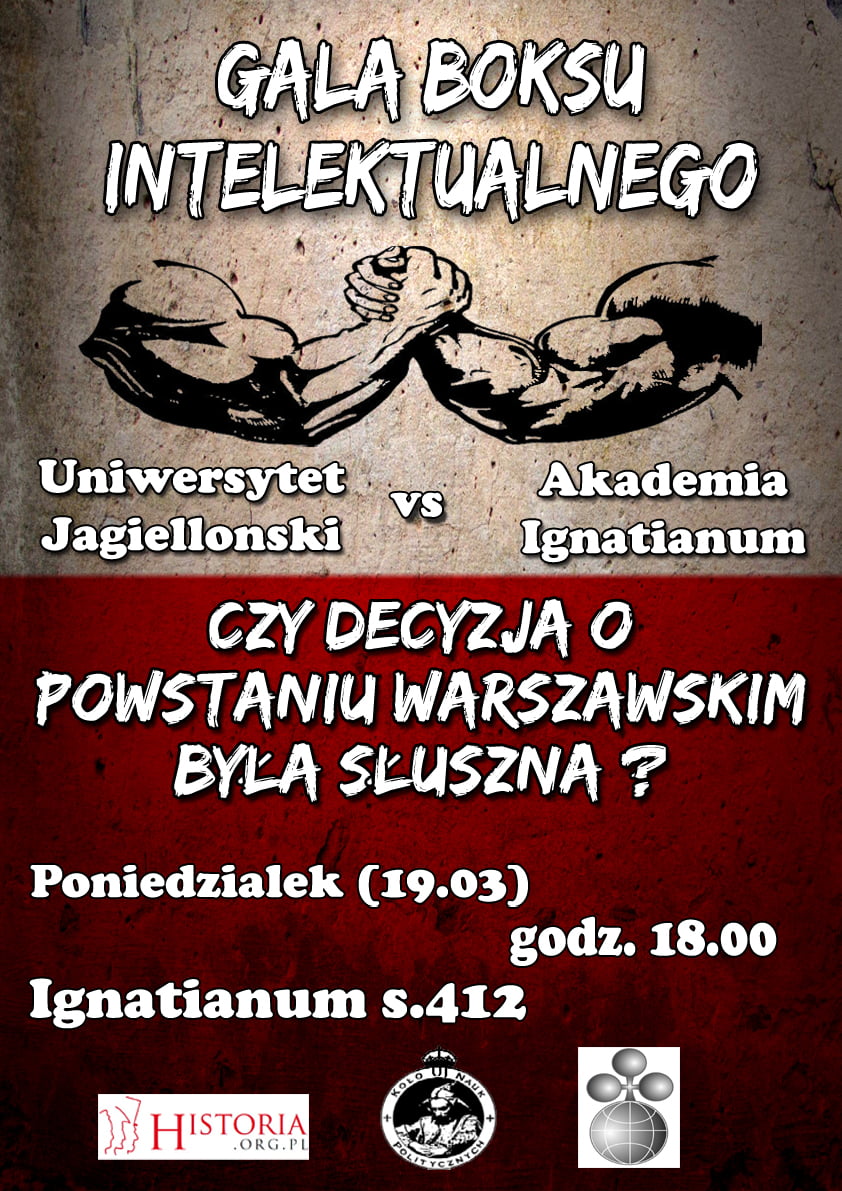 Koło Nauk Politycznych Uniwersytetu Jagiellońskiego oraz Koło Naukowe Studentów Politologii Akademii Ignatianum zapraszają na organizowaną pod patronatem Bractwa św. Benedykta debatę oksfordzką „Czy decyzja o Powstaniu Warszawskim była słuszna?” 19 marca 2012 r. (poniedziałek) o godz. 18.00, Akademia Ignatianum, ul. Kopernika 26, s. 412.