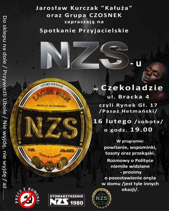 Z okazji rocznicy rejestracji NZS 17 lutego 1981 r. zapraszamy dzisiaj – 16 lutego – wszystkich na spotkanie o godz. 19.00 do Czekolady przy ul. Brackiej 4.