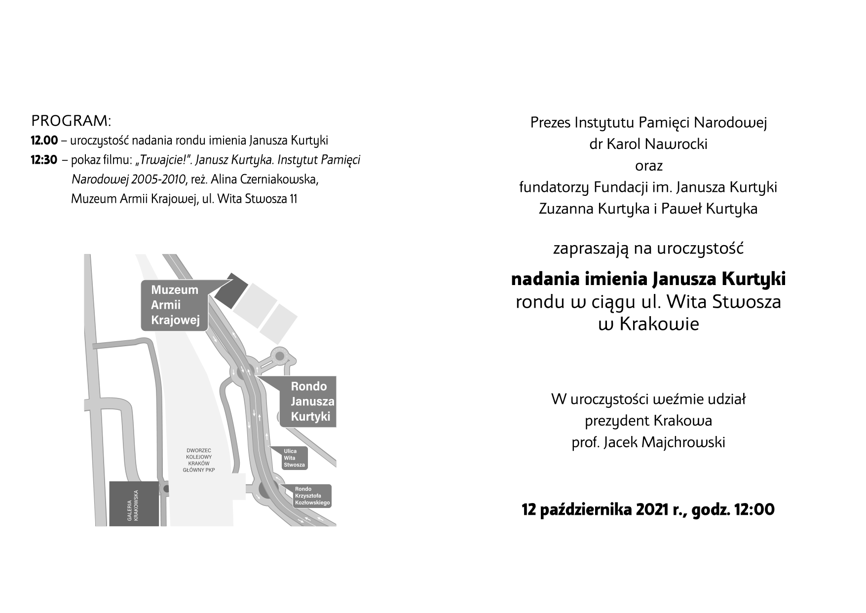 Jego imię będzie nosić rondo w ciągu ulicy Wita Stwosza – w pobliżu Muzeum AK. O uhonorowanie Janusza Kurtyki wnioskował radny PiS Adam Kalita. Rada Miasta Krakowa uchwałę w tej sprawie przyjęła 7 lipca 2021 r.