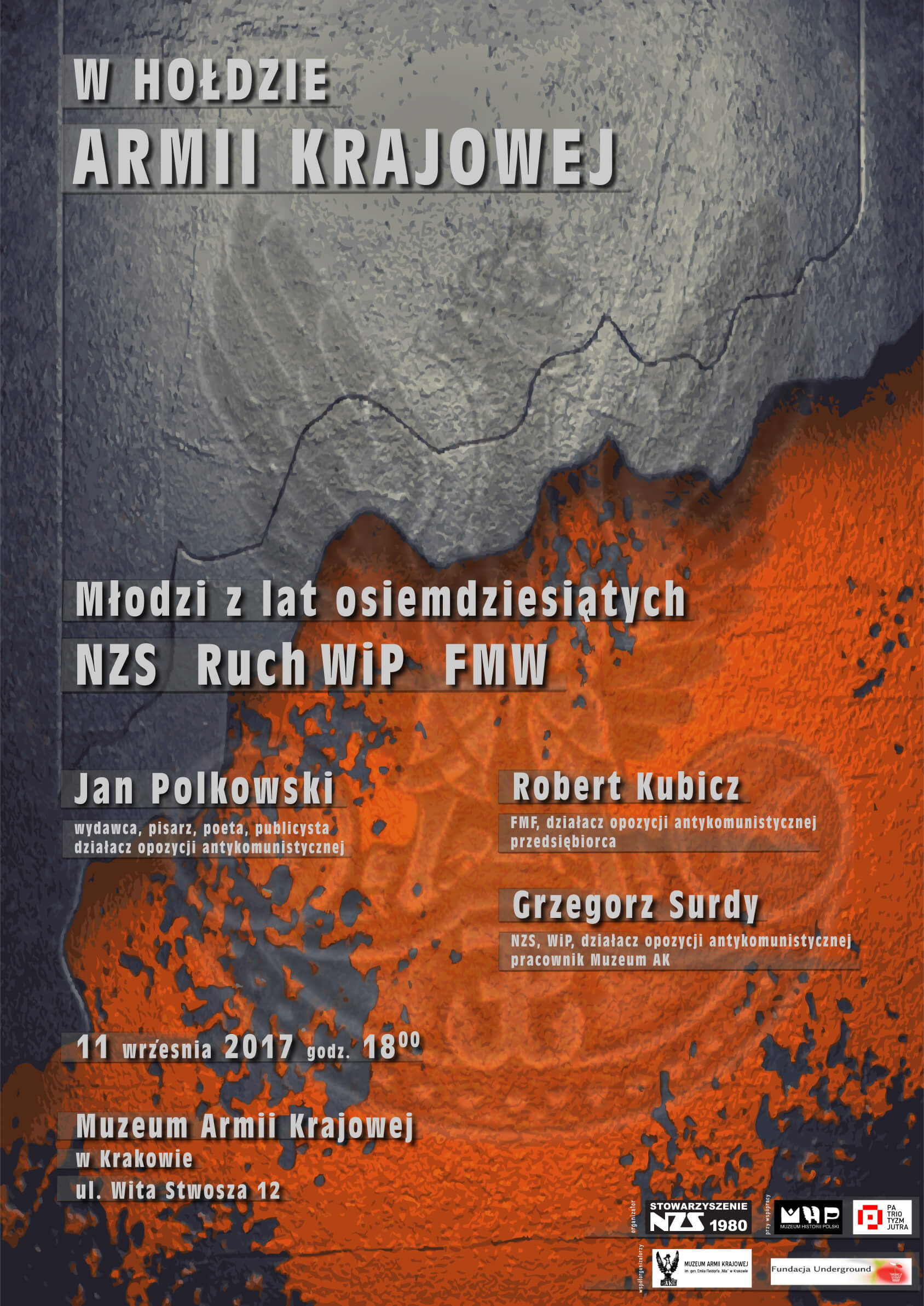 11 IX 2017 r. zapraszamy na kolejne spotkanie z cyklu „W hołdzie Armii Krajowej” poświęcone młodym (wówczas) ludziom z NZS, WiP i FMW. Prowadzącym będzie Jan Polkowski.