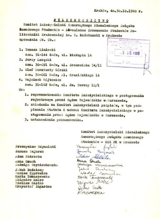 W oświadczeniu Grupy Inicjatywnej powstałej 15 września 1980 r. znajdujemy zarys programu działania: „Celem naszym jest stworzenie autentycznego ruchu studenckiego niezależnego od struktur polityczno-administracyjnych PRL i realizowanie zasad niezależności studenckiej”. Grupa Inicjatywna zwołała na 22 września o godz. 11.00 zebranie założycielskie „Wolnego Zrzeszenia Studentów” (tak początkowo brzmiała nazwa organizacji). Trwały jeszcze wakacje. Na obwieszczonym plakatami spotkaniu stawili się więc przede wszystkim studenci przebywający akurat w Krakowie. W budynku Instytutu Filozofii UJ i na dziedzińcu Collegium Broscianum przy ul. Grodzkiej 52 zgromadziło się kilkaset osób. „Solidarność” reprezentował prof. Ryszard Łużny z UJ. Przedstawiono cele nowej organizacji studenckiej pod nazwą „Niezależne Zrzeszenie Studentów Polskich” i projekt jej statutu. Pod deklaracją członkowską podpisało się 421 osób, w tym kilka z krakowskiego SKS-u. Politechnikę Krakowską reprezentowało ponad 50 studentów. Jeszcze tego samego dnia po południu, w prywatnym mieszkaniu przy ul. Chopina, odbyło się pierwsze zebranie politechników, na którym najliczniejszą grupę stanowili studenci architektury. Ostatecznie w skład Komitetu Założycielskiego nowej organizacji studenckiej na PK weszli: Przemysław Szymalski, Janusz Bajorek, Adam Kutrzeba, Anna Osuch, Jadwiga Woyciechowska, Jakub Bodziony, Wacław Tyrpowicz, Maria Tomaszewska, Zbigniew Malec, Wiesław Szatko i Krzysztof Ingarden.