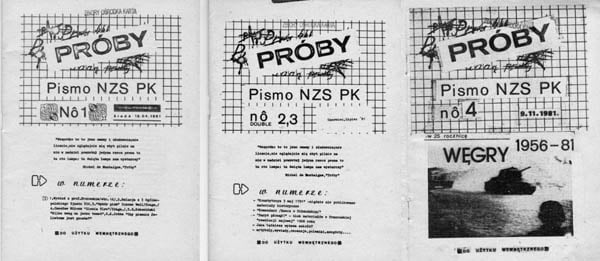 Pierwsze gazetki NZS PK były wywieszane m.in. na uczelnianej stołówce. Ich kontynuacją było pismo NZS PK, „Próby”, ukazujące się w nakładzie 1000 egz. Pierwszy numer pisma z nadrukiem „Do użytku wewnętrznego” ukazał się z datą 15.04.1981 r. Jego redaktorem naczelnym był Krzysztof Banasiak, a w skład redakcji weszli ponadto Maja Bogdani, Grzegorz Kłos i Zbigniew Kokosiński. Numer zawierał m.in. relację Grzegorza Kłosa z I Zjazdu NZS, który rozpoczął się 3.04.1981 w Krakowie w murach ówczesnej WSP, a także wywiad Krzysztofa Banasiaka z prof. Wiktorem Bonieckim o tematyce gospodarczej, fragmenty prozy Miłosza i Simone Weil, a także teksty członków Zrzeszenia. Przydział papieru pochodził z Politechniki, a druk odbywał się w zakładzie poligraficznym PK. Do 13.12.1981 ukazały się w sumie cztery numery pisma o łącznej objętości 112 stron formatu A5. Część nakładu trafiała do Łodzi (PŁ i UŁ), Warszawy i Gdańska. Zmieniał się skład redakcyjny. Redaktorem naczelnym ostatniego numeru „Prób” przed stanem wojennym, poświęconego proroczo 25. rocznicy powstania na Węgrzech (z czołgiem Armii Czerwonej na ulicach Budapesztu na okładce), został Wojciech Przeździecki. Redakcja zaś, w składzie poszerzonym o Iwonę Storożuk (UJ) i Jana Pawlickiego, rozrosła się do 10 osób! Archiwalne numery „Prób” znajdują się obecnie m.in. w zbiorach Biblioteki Jagiellońskiej i FCDCN w Krakowie oraz Open Society Archives w Budapeszcie, a w wersji cyfrowej w Polskiej Bibliotece Internetowej (www.pbi.edu.pl). Ponadto NZS PK wydawało w czasie legalnej działalności Zrzeszenia w roku 1981 „Serwis Informacyjny NZS Politechniki Krakowskiej” i w okresie jesiennego strajku „Serwis Informacyjny SKS [Studenckiego Komitetu Strajkowego] Politechniki Krakowskiej”.