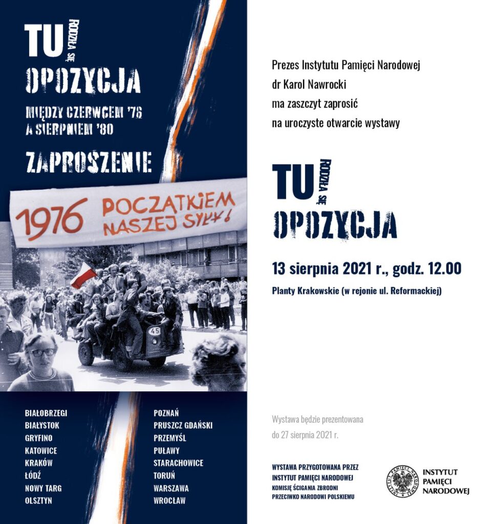 Zapraszamy na otwarcie wystawy plenerowej „Tu rodziła się opozycja. Między Czerwcem ‘76, a Sierpniem ‘80”. Inauguracja wystawy nastąpi 13 sierpnia 2021 r. o godz. 12 na Plantach w pobliżu ul. Reformackiej i pl. Szczepańskiego. Będzie ją można oglądać do 27 sierpnia.