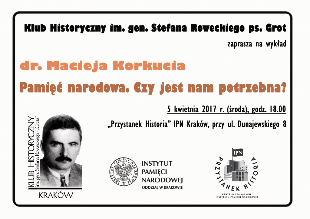 Krakowski Klub Historyczny im. gen. Stefana Roweckiego ps. Grot zaprasza na drugie w tym roku spotkanie. Tym razem gościem będzie dr Maciej Korkuć, z którym będzie można podyskutować na temat Pamięci narodowej. Czy jest nam potrzebna?