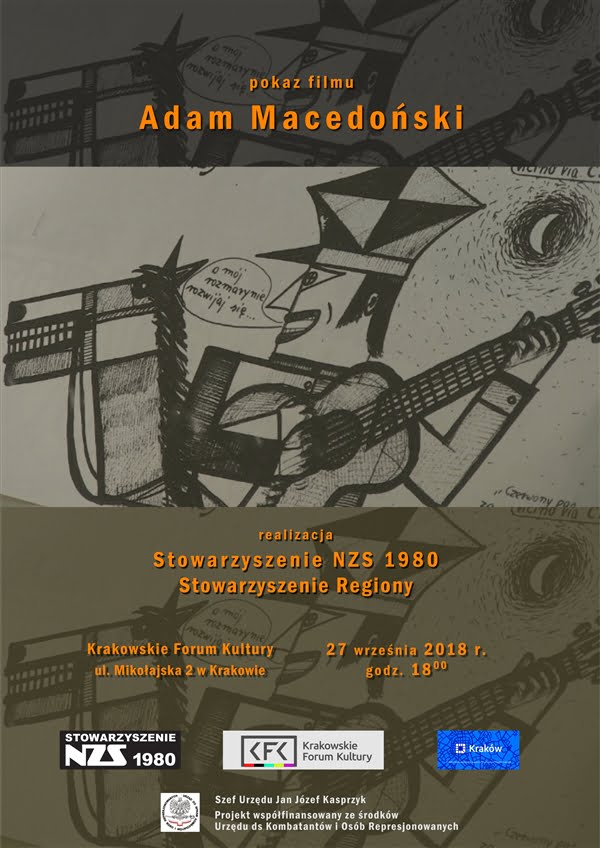 27 września 2018 o godz 18.00 zapraszamy do Krakowskiego Forum Kultury przy ul. Mikołajskiej 2 w Krakowie na pokaz filmu o Adamie Macedońskim, którego współrealizatorem jest Stowarzyszenie NZS 1980.