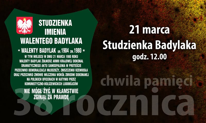 21 marca 2018 r. obchodzimy 38 rocznicę śmierci Walentego Badylaka, który dokonał samospalenia na krakowskim Rynku.