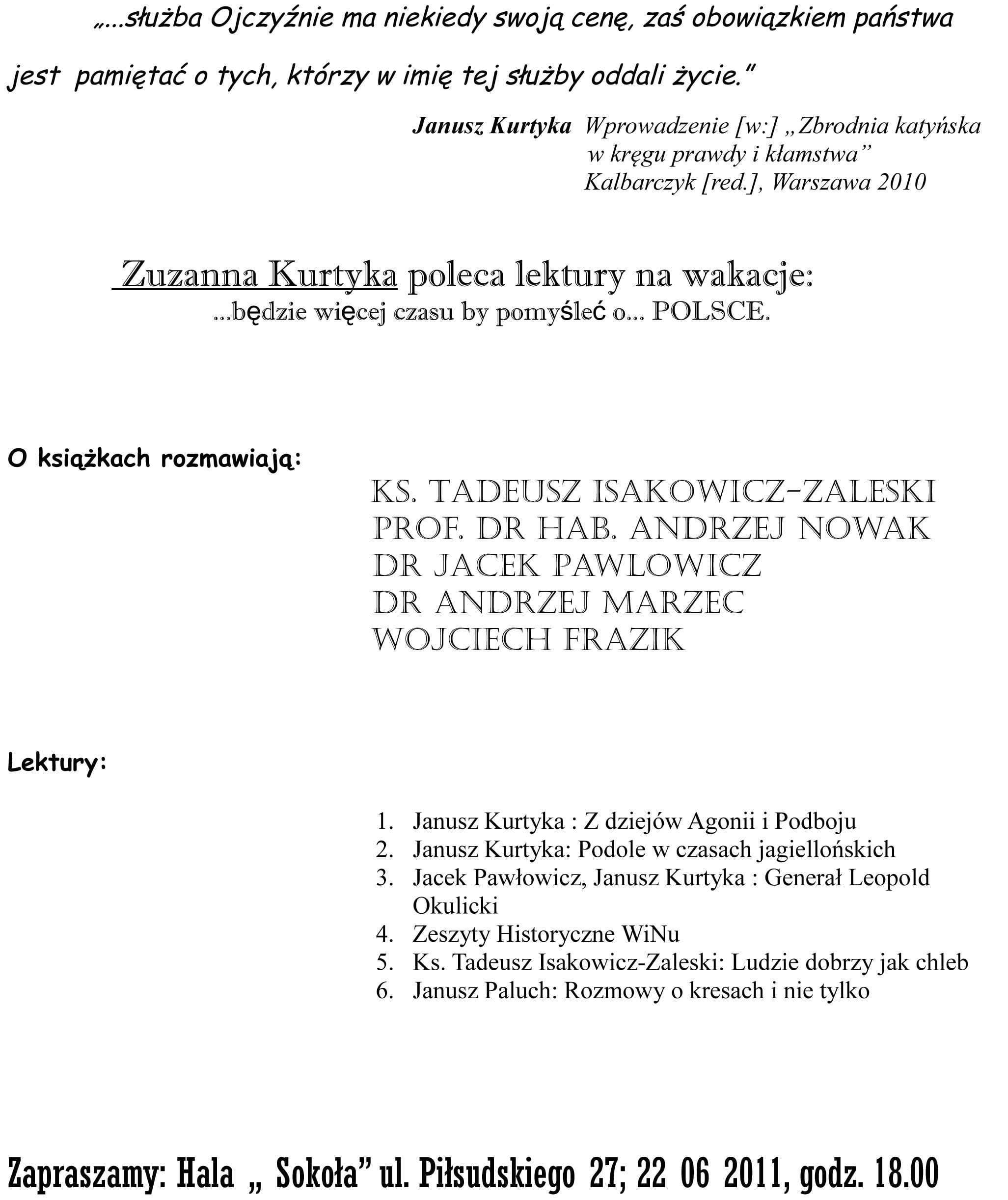 Zapraszamy 22 czerwca 2011 r. o godz. 18.00 na spotkanie poświęcone publikacjom autorstwa Janusza Kurtyki. W spotkaniu udział wezmą: Zuzanna Kurtyka, ks. Tadeusz Isakowicz-Zaleski, prof. dr hab. Andrzej Nowak, dr Jacek Pawłowicz, dr Andrzej Marzec oraz Wojciech Frazik.