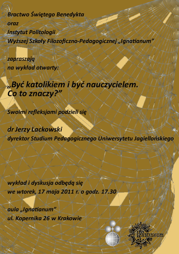 „Być katolikiem i być nauczycielem. Co to znaczy?”. Swoimi refleksjami podzieli się dr Jerzy Lackowski dyrektor Studium Pedagogicznego Uniwersytetu Jagiellońskiego. Wykład i dyskusja odbędą się we wtorek, 17 maja 2011 r. o godz. 17.30 aula „Ignatianum”, ul. Kopernika 26 w Krakowie.