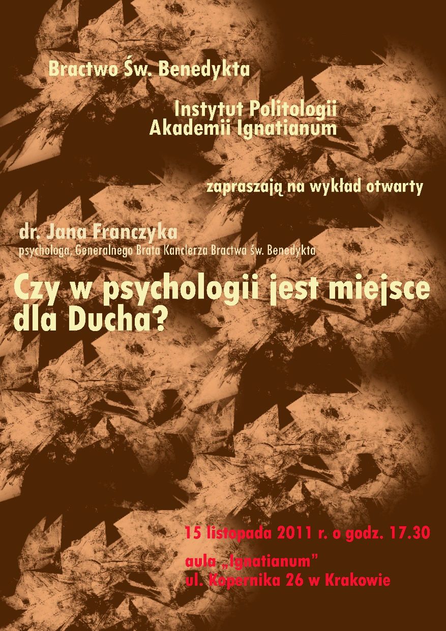 Bractwo św. Benedytka zaprasza na kolejne spotkanie. Wykład „Czy w psychologii jest miejsce dla Ducha?” wygłosi dr Jan Franczyk – 15 listopada o godz. 17.30 w auli Ignatianum.