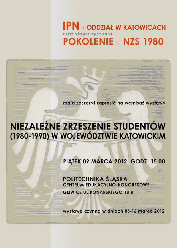 Zapraszamy na wernisaż wystawy „Niezależne Zrzeszenie Studentów w województwie katowickim 1980-1990”, który odbędzie się 9 marca 2012 r. o godz. 15.00 w Centrum Edukacyjno-Kongresowym Politechniki Śląskiej w Gliwicach przy ul. Konarskiego 18 B. Jest to wystawa przygotowana przez katowicki oddział IPN, Stowarzyszenie Pokolenie i Stowarzyszenie NZS 1980 z okazji XXX lecia rejestracji NZS i prezentowana rok temu na Uniwersytecie Śląskim. Tym razem miejscem jej prezentacji będzie Politechnika Śląska. Wystawa będzie prezentowana do 16 marca 2012 r.
