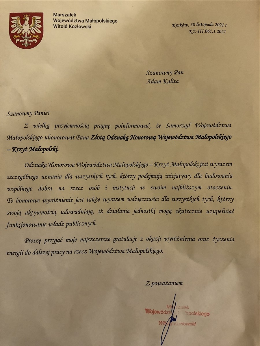W dniu 30 listopada 2021 r. samorząd województwa małopolskiego uhonorował naszego kolegę ze stowarzyszenia, Adama Kalitę, Złotą Odznaką Honorową Województwa Małopolskiego – Krzyż Małopolski.